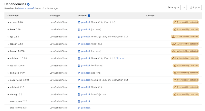 | Location | For system dependencies, this lists the image that was scanned. For application dependencies, this shows a link to the packager-specific lock file in your project that declared the dependency. It also shows the direct dependents of the dependency, if any, and if supported. |