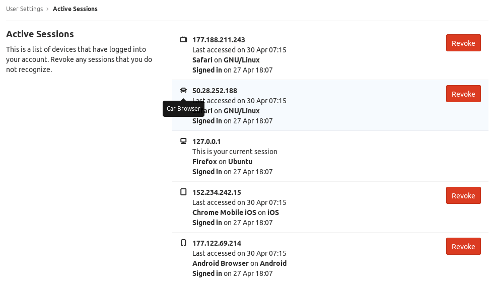 4. Select Revoke next to a session. The current session cannot be revoked, as this would sign you out of GitLab.