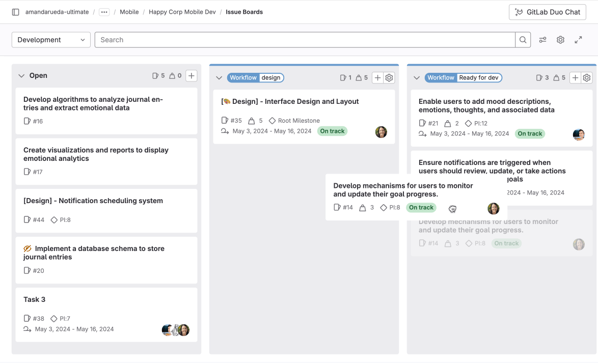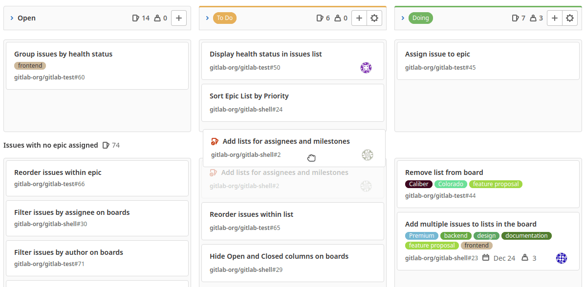 Issue boards help you to visualize and manage your entire process in GitLab. You add your labels, and then create the corresponding list for your existing issues. When you're ready, you can drag your issue cards from one step to another one.